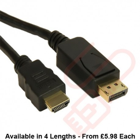 Display Port Male - HDMI Male. Available as 1Mtr, 2Mtr, 3Mtr & 5Mtr Lengths. |