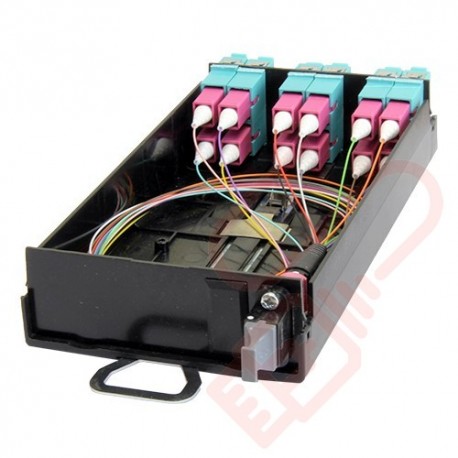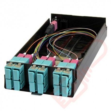 This Zettonics OM4 multimode cassette has 12 fibre (6 Duplex) SC connectors terminating to a 12 core MTP connector at the rear.